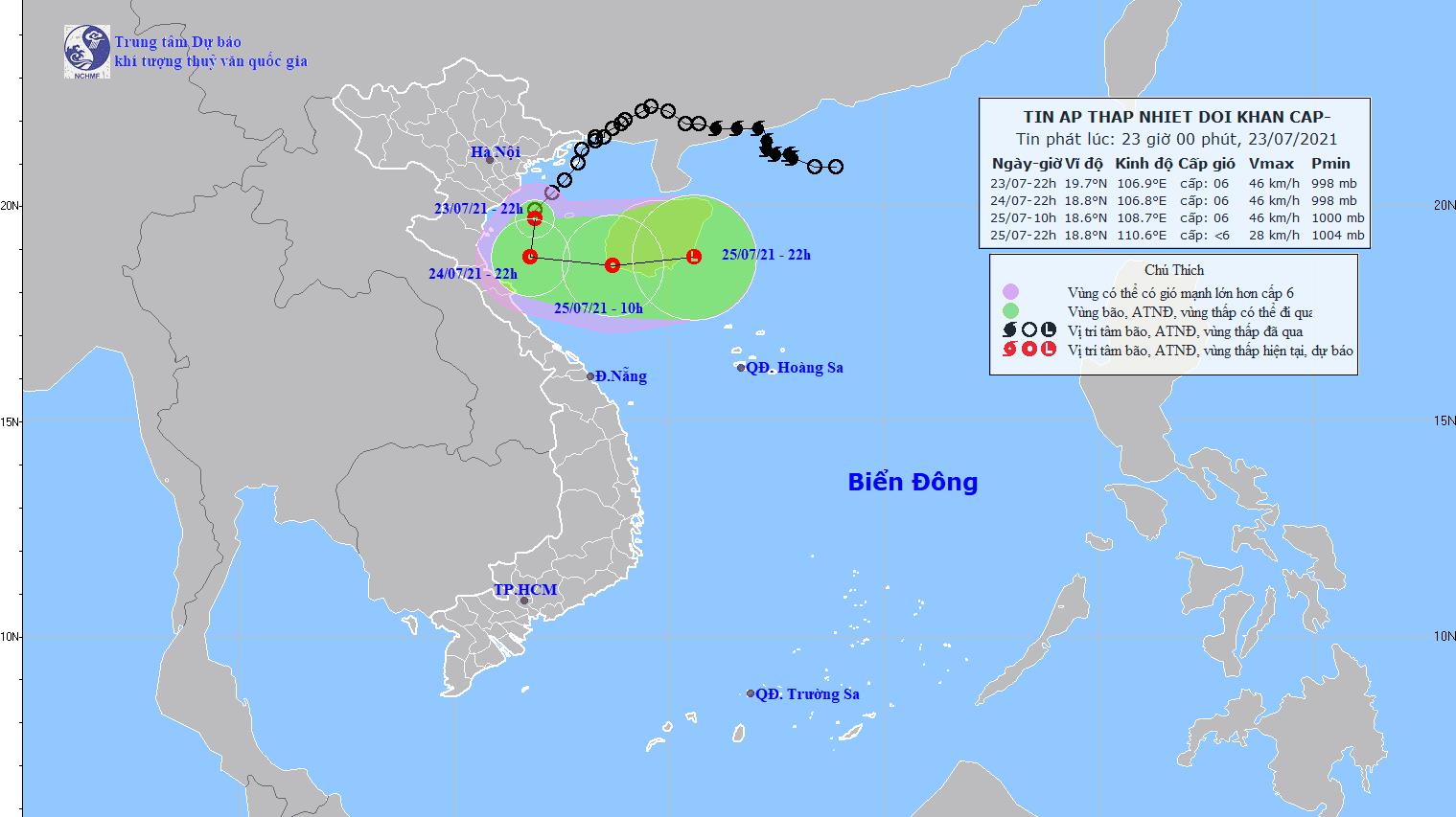 Dự báo trong 24 giờ tới, áp thấp nhiệt đới di chuyển theo hướng Nam Tây Nam, mỗi giờ đi được khoảng 5km. Đến 22 giờ ngày 24/7, vị trí tâm áp thấp nhiệt đới ở khoảng 18,8 độ Vĩ Bắc; 106,8 độ Kinh Đông, cách Ninh Bình khoảng 160km về phía Đông Nam. Sức gió mạnh nhất vùng gần tâm áp thấp nhiệt đới mạnh cấp 6 (40-50km/giờ), giật cấp 8.