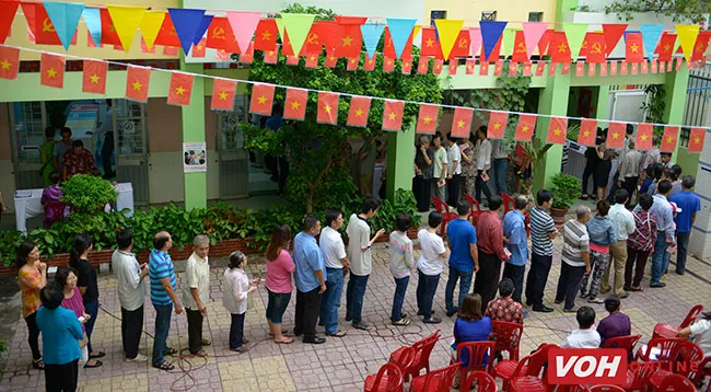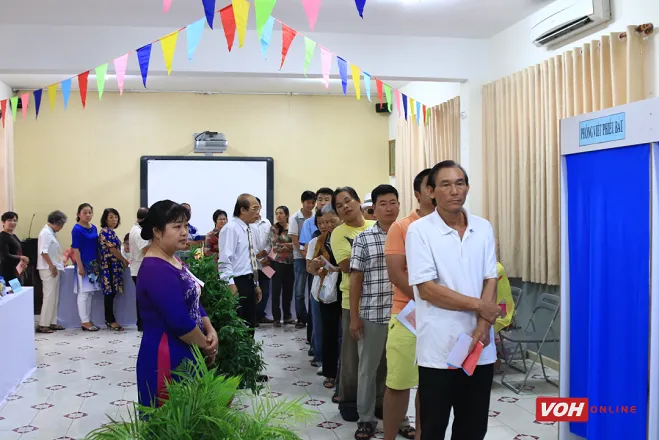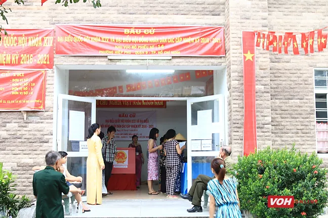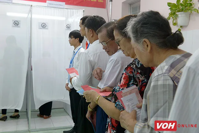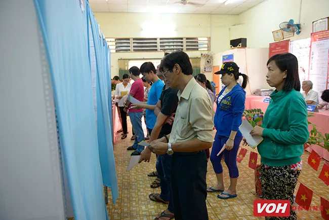 Cử tri xếp hàng chờ viết phiếu bầu tại điểm bầu cử 109, P.17, Q.Bình Thạnh, TPHCM (Ảnh: Khiêm Huân)