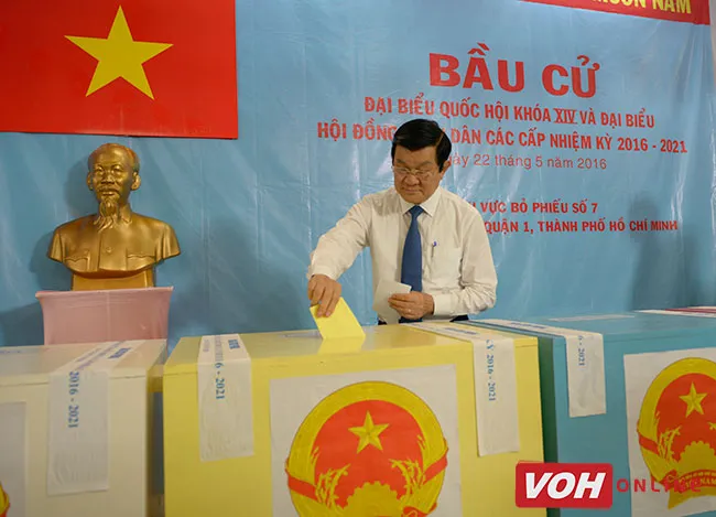 Ông Trương Tấn Sang - Nguyên Ủy viên Bộ Chính Trị, Nguyên Chủ tịch nước CHXHCN Việt Nam bỏ phiếu tại điểm bầu cử số 7, P.Tân Định, Q.1, TPHCM (Ảnh: Khiêm Huân)