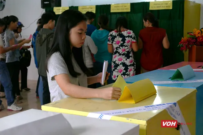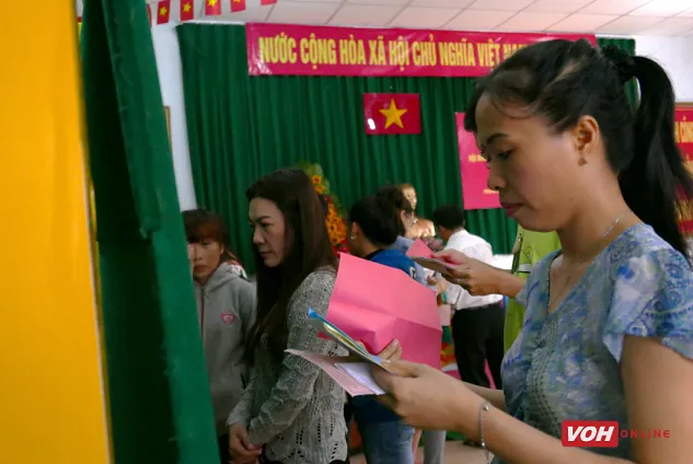 Cử tri xem lại phiếu bầu trước khi vào phòng lựa chọn đại biểu tại Khu vực số 12, Đặng Văn Bi, P.Trường Thọ, Q.Thủ Đức, TPHCM (Ảnh: Lan Hương)