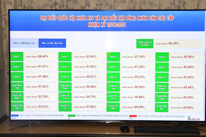 Bảng điện tử thể hiện tỷ lệ cử tri đi bầu tại TPHCM đến 16h ngày 22/5 (Ảnh: Hồng Lĩnh)
