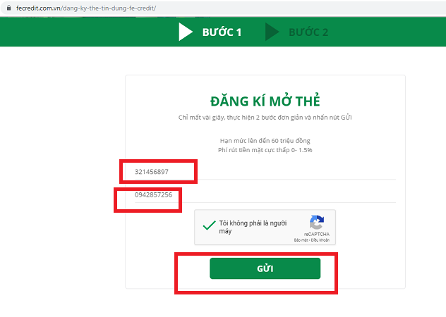 - Bước 2: Điền số CMND và số điện thoại. Click Gửi.