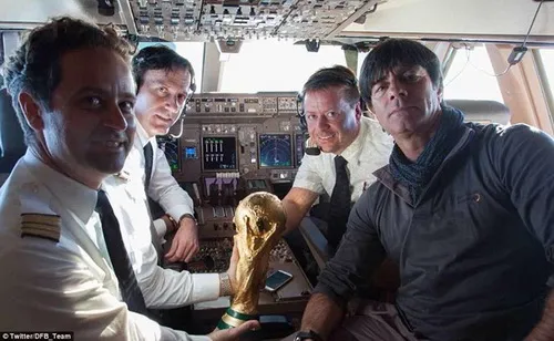 .HLV Joachim Loew cùng chiếc Cup VĐTG chia vui cùng tổ lái trên chuyến bay.