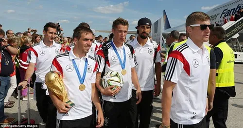 Đội trưởng Lahm cùng các đồng đội tươi cười khi vừa bước xuống sân bay.