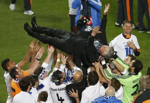 Màn vinh danh HLV Ancelotti của các cầu thủ Real - Ảnh: NLĐ.