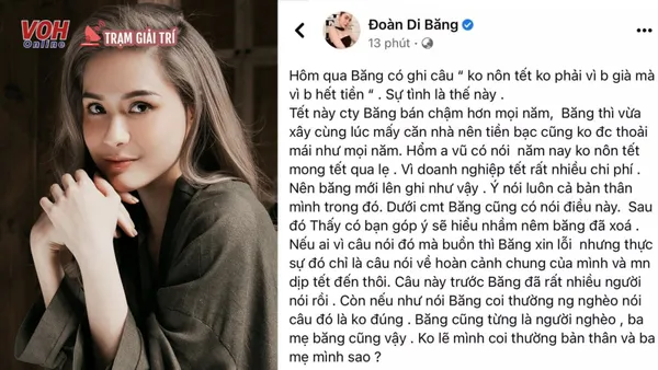 Mới đây, trên trang fanpage của Đoàn Di Băng đăng tải dòng trạng thái khiến cộng đồng mạng tranh cãi trái chiều. Theo đó, “đại gia quận 7” đã viết nội dung như sau: "Băng thấy mấy bạn hay bảo: "Mình không còn thích Tết nữa, chắc mình già rồi". Không phải bạn già đâu, do bạn hết tiền chứ ba mẹ mình đây, nôn Tết lắm".