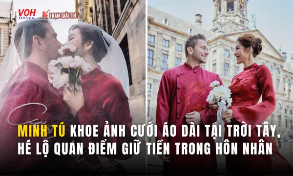 Bộ áo dài tối giản, không có bất kỳ hoa văn hay họa tiết đặc biệt cầu kỳ nào càng làm bật lên vẻ đẹp ngọt ngào, dịu dàng của Minh Tú. Điểm nhấn thú vị chính là phần khăn voan trắng được thêu dòng chữ nổi “Cưới rồi nha!”. Chồng ngoại quốc của Minh Tú cũng diện trang phục đỏ cùng tông. Cả hai tay trong tay đầy ngọt ngào như đang muốn chia sẻ niềm vui và hạnh phúc với tất cả mọi người.