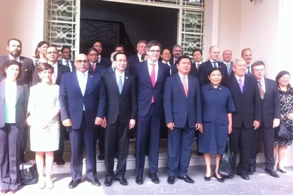 Bí thư Thành ủy TPHCM Đinh La Thăng chụp hình lưu niệm cùng các Tổng lãnh sự các nước tại TPHCM (Ảnh: Mỹ Hương)