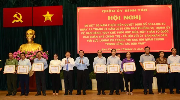 Dịp này, Quận ủy - Ủy ban Nhân dân quận Bình Tân tặng giấy khen cho 27 tập thể và 46 cá nhân có thành tích xuất sắc trong tổ chức triển khai thực hiện Quyết định số 3614 của Ban Thường vụ Thành ủy.