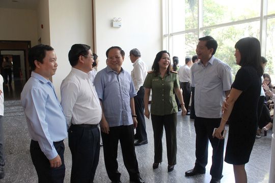 Bí thư Thành ủy TP HCM Đinh La Thăng (thứ 2 từ phải qua) và Phó Bí thư Thường trực Thành ủy TP HCM Tất Thành Cang (thứ 3 từ trái qua) trao đổi với đại biểu bên lề hội nghị. Ảnh: NLĐ