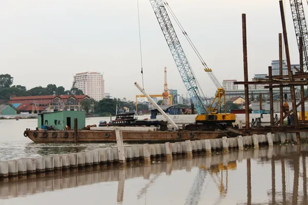Bờ tả sông Sài Gòn, đoạn KĐT Mới Thủ Thiêm đang được kè bờ làm dự án 4 tuyến đường chính