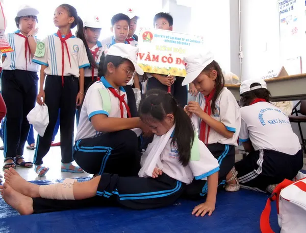Các em học sinh tham gia phần thi thực hành Hội thi Sơ cấp cứu.