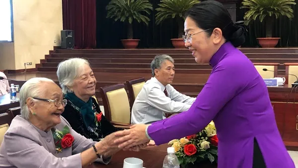 Bà Võ Thị Dung (phải) - Phó Bí thư Thành ủy TPHCM, thăm hỏi các đại biểu.
