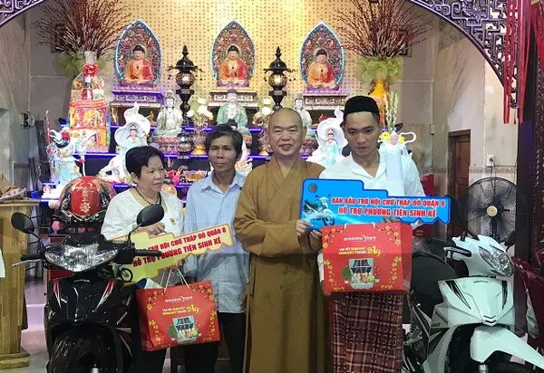 Đại Đức Thích Huệ Công cùng mạnh thường quân trao tặng xe máy làm phương tiện sinh kế cho hai hộ gia đình khó khăn.