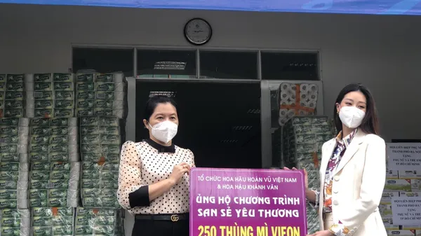 Hưởng ứng chương trình “Triệu phần quà san sẻ yêu thương” do Hội Liên hiệp Phụ nữ Việt Nam phát động, chiều 8/10, Hoa hậu Nguyễn Trần Khánh Vân đã gửi tặng 250 thùng mì ăn liền đến Hội Liên hiệp Phụ nữ TPHCM.