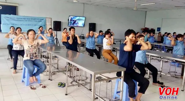 Tại các đơn vị thường dành từ 10-15 phút sau mỗi ca làm việc tổ chức cho công nhân tập luyện với sự hướng dẫn của hướng dẫn viên đến từ Trung tâm văn hoá thể dục thể thao Nguyễn Du, quận 1.