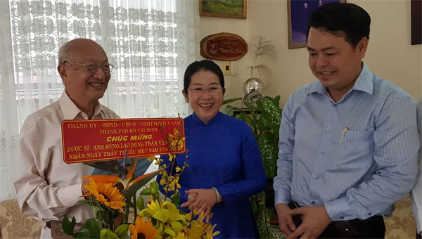 Nhân Ngày Thầy thuốc Việt Nam (27/2), cũng trong sáng nay, đoàn lãnh đạo Thành phố do bà Tô Thị Bích Châu - Ủy viên Ban Thường vụ Thành ủy, Chủ tịch Ủy ban Mặt trận Tổ quốc Việt Nam Thành phố làm trưởng đoàn đã đến thăm bác sĩ Trương Xuân Liễu – nguyên Giám đốc Sở Y tế Thành phố và Phó giáo sư - bác sĩ Trần Văn Bé – nguyên Giám đốc Bệnh viện Truyền máu huyết học.