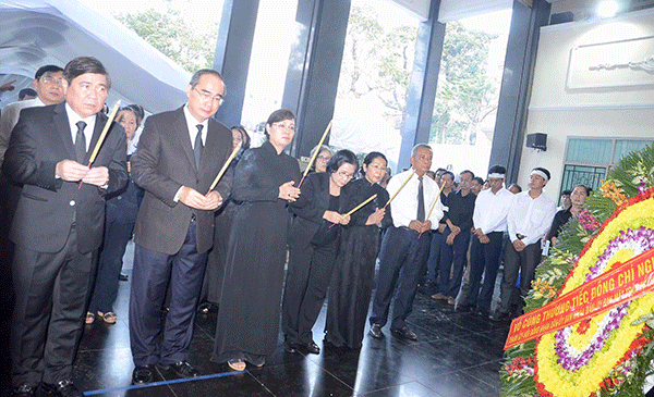 Bắt đầu lễ viếng, Đoàn đại biểu Thành ủy, HĐND, UBND, Uỷ ban MTTQ Việt Nam Thành phố do Bí thư Thành ủy Nguyễn Thiện Nhân làm trưởng đoàn vào viếng và chia buồn cùng gia đình.