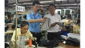 Lê Văn Vũ (bên trái) kiểm tra sản phẩm tại chuyền may. Ảnh: SGGP