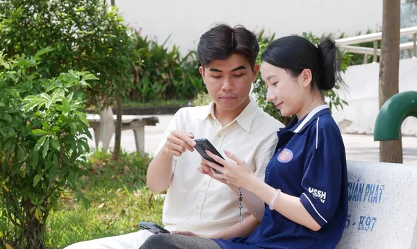 Quốc Thịnh và Thảo Nhân chủ động tìm hiểu thông tin bầu cử trên điện thoại - Ảnh: Kim Anh