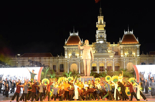 Từ 19h30 đã có rất đông người dân, khán giả, các bạn học sinh sinh viên tập trung về khu vực sân khấu công viên tượng đài Chủ tịch Hồ Chí Minh để theo dõi chương trình nghệ thuật “Khúc ca khải hoàn”. Sự hào hùng, tự hào và vui tươi là không khí xuyên suốt buổi biểu diễn nghệ thuật được thể hiện qua nhiều ca khúc như: Câu hò bên bờ Hiền Lương, Cô gái Sài Gòn đi tải đạn, Cô gái mở đường, Tình ca, Sài Gòn quật khởi.