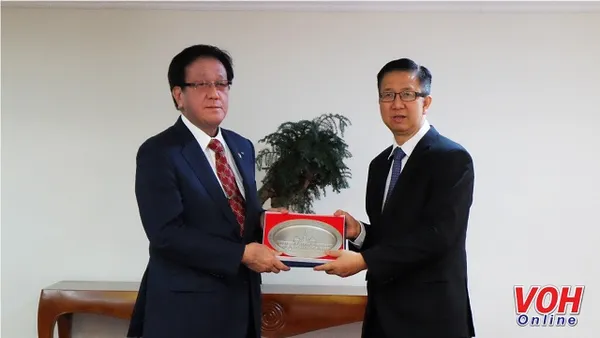 Ông Phạm Đức Hải - Phó Chủ tịch HĐND TPHCM (phải) tặng quà lưu niệm cho ông Yasuhiro Tsuji, Phó Thống đốc tỉnh Hokkaido, Nhật Bản