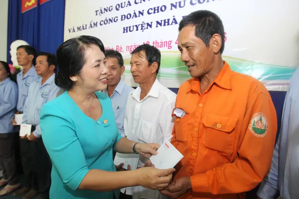 Bà Trần Kim Yến - Chủ tịch Liên đoàn lao động TP đã đến tặng quà cho công nhân