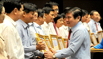Ông Nguyễn Thành Phong, chủ tịch UBND TP.HCM, trao tặng bằng khen cho các đơn vị hoàn thành xuất sắc nhiệm vụ . Ảnh minh họa: TTO