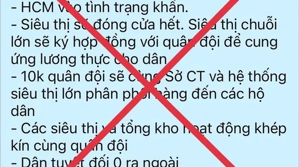 Cụ thể, từ trưa ngày 26/11 trên không gian mạng lan truyền nội dung: “Thông tin khẩn từ Văn phòng Chính phủ (vừa họp xong với Bộ Quốc Phòng, mai ra thông báo). TPHCM vào tình trạng khẩn. Siêu thị sẽ đóng cửa hết; siêu thị chuỗi lớn sẽ ký hợp đồng với quân đội để cung ứng lương thực cho dân....”.