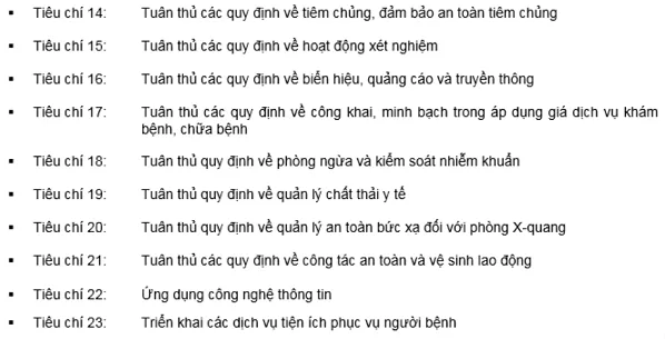Bộ tiêu chí chất lượng áp dụng cho phòng khám đa khoa phiên bản 3.0 bao gồm 23 tiêu chí, cụ thể như sau: