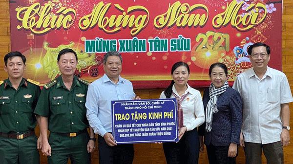 Sáng 23/1, đoàn đại biểu TPHCM do bà Phan Kiều Thanh Hương, Phó Chủ tịch Ủy ban Mặt trận Tổ quốc Việt Nam Thành phố làm trưởng đoàn đến thăm và tặng quà đồng bào khó khăn, đồng bào dân tộc thiểu số và tặng quà Tết cho Bộ Chỉ huy Bộ đội Biên phòng đang làm nhiệm vụ phòng, chống dịch Covid-19 tại khu vực biên giới trên địa bàn tỉnh Bình Phước nhân dịp Tết Nguyên đán Tân Sửu 2021.