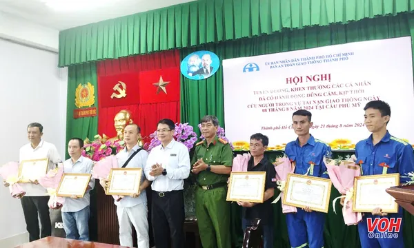Sáng 21/8, Ban An toàn giao thông TPHCM phối hợp với Công an TP Thủ Đức tổ chức tuyên dương, khen thưởng 7 cá nhân có hành động dũng cảm, kịp thời cứu người trong vụ tai nạn giao thông tại cầu Phú Mỹ vào ngày 8/8/2024.