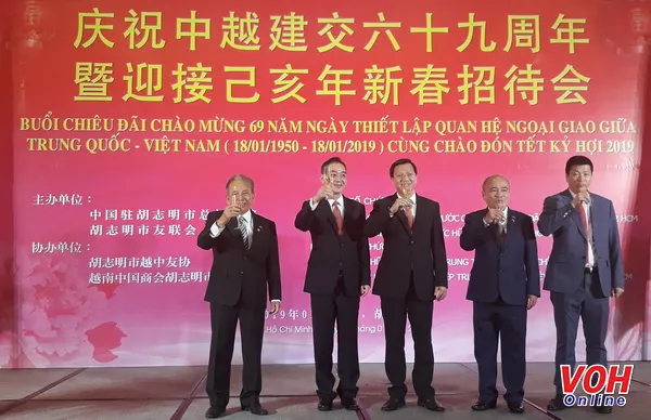 Tối 16/1, Tổng lãnh sự quán Trung Quốc tại TPHCM và Liên hiệp các tổ chức hữu nghị TPHCM tổ chức tiệc chiêu đãi nhân dịp kỷ niệm 69 năm thiết lập quan hệ ngoại giao Việt Nam-Trung Quốc (18/1/1950 - 18/1/2019) và chào mừng năm mới 2019.