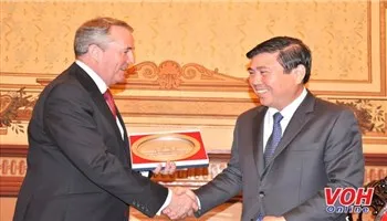 Chủ tịch UBND TP Nguyễn Thành Phong tặng quà lưu niệm cho ông Liam Fox.