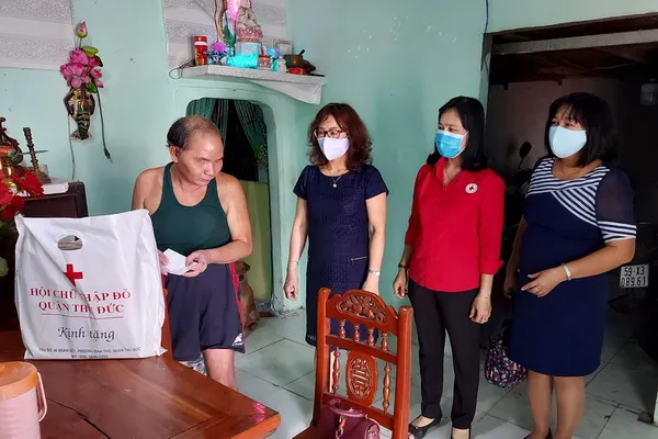 Đại diện lãnh đạo Hội Chữ thập đỏ quận Thủ Đức đến tận nhà trao quà và động viên người khiếm thị vượt qua khó khăn trong mùa đại dịch Covid-19.