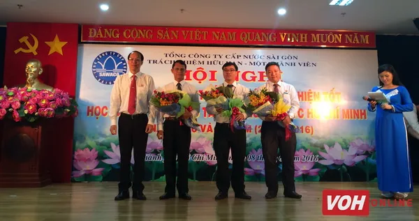 Ông Dương Hồng Đệ Phó Bí thư Đảng ủy Tổng Công ty cấp nước SAWACO chúc mừng các gương điển hình.