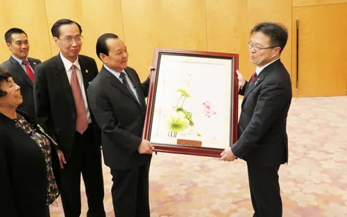 | Bí thư Thành ủy TPHCM Lê Thanh Hải tặng quà lưu niệm ông Hiroshige Seko, Phó Chánh Văn phòng Nội các Nhật Bản - Ảnh: SGGP. |