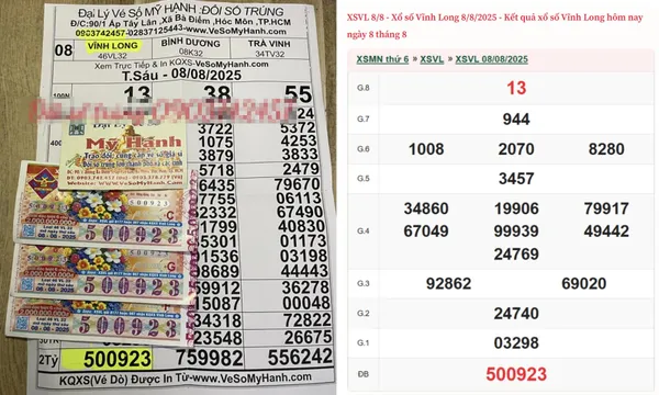 Ba tờ vé số trúng thưởng có dãy 500923, thuộc đài Vĩnh Long, mở thưởng ngày 8/8, với tổng giá trị giải thưởng là 6 tỷ đồng (chưa trừ thuế).