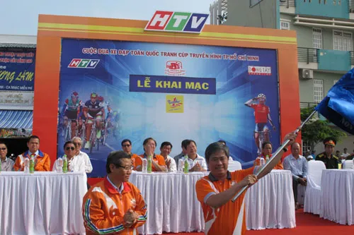 | Phó Chủ tịch UBND TP Hứa Ngọc Thuận trao cờ lệnh cho ông Dương Thanh Tùng, Trưởng Ban tổ chức cuộc đua (ảnh: Hồng Lĩnh) |