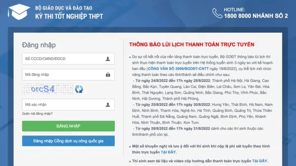 Bộ GD&ĐT cũng vừa thông báo lùi lịch thí sinh thực hiện thanh toán trực tuyến trên hệ thống tuyển sinh 3 ngày so với kế hoạch ban đầu do sự cố kết nối của nền tảng thanh toán trực tuyến. Theo đó, lịch mở chức năng thanh toán theo các tỉnh/thành sẽ điều chỉnh như sau: - Từ ngày 24/8/2022 đến 17 giờ ngày 29/8/2022: Thành phố Hà Nội, Hà Giang, Cao Bằng, Bắc Kạn, Tuyên Quang, Lào Cai, Điện Biên, Lai Châu, Sơn La, Yên Bái, Hòa Bình, Thái Nguyên, Lạng Sơn, Quảng Ninh, Bắc Giang, Phú Thọ, Vĩnh Phúc, Bắc Ninh, Hải Dương, Thành phố Hải Phòng. - Từ ngày 25/8/2022 đến 17 giờ ngày 30/8/2022: Hưng Yên, Thái Bình, Hà Nam, Nam Định, Ninh Bình, Thanh Hóa, Nghệ An, Hà Tĩnh, Quảng Bình, Quảng Trị, Thừa Thiên Huế, Thành phố Đà Nẵng, Quảng Nam, Quảng Ngãi, Bình Định, Phú Yên, Khánh Hòa, Ninh Thuận, Bình Thuận, Kon Tum. - Từ ngày 26/8/2022 đến 17 giờ ngày 31/8/2022 dành cho các thí sinh thuộc các tỉnh/thành phố còn lại. |