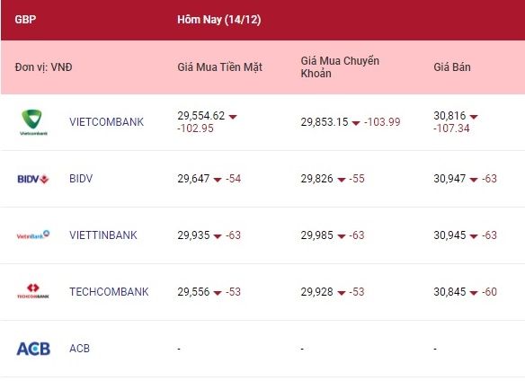 Ngày 14/12, tỷ giá Bảng Anh tại Ngân hàng Nhà nước đứng ở mức: 29.711 đồng (mua) và 31.548 đồng (bán).