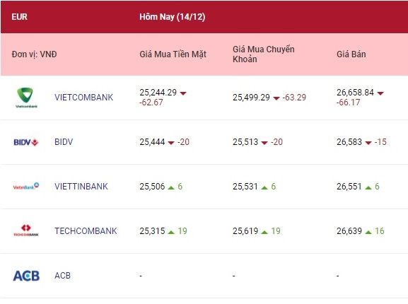 Ngân hàng Nhà nước niêm yết tỷ giá Euro ngày 14/12 đang đứng ở mức: 25.371 đồng (mua) và 26.941 đồng (bán).
