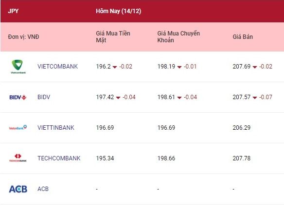 Ngân hàng Nhà nước niêm yết tỷ giá Yên Nhật của phiên giao dịch hôm nay 14/12 ở mức: 198 đồng (mua) và 210 đồng (bán).