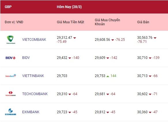 Các ngân hàng khác niêm yết tỷ giá bảng Anh hôm nay thay đổi quanh mức 29.312 đồng (mua) và 30.710 đồng (bán).