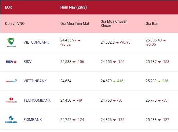 Ngân hàng Nhà nước niêm yết tỷ giá euro ngày 28/3 đang đứng ở mức: 24.636 đồng (mua) và 26.160 đồng (bán).