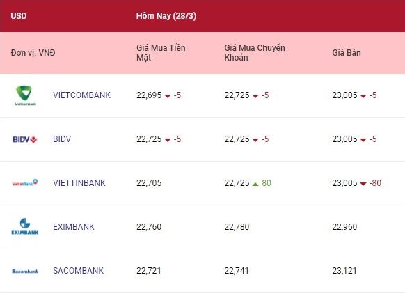 Vietinbank: 22.728 đồng/USD (mua) và 23.008 đồng/USD (bán).