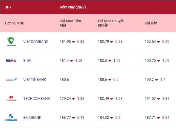 Ngân hàng Nhà nước niêm yết tỷ giá yên Nhật hôm nay 28/3 đang ở mức: 184 đồng (mua) và 195 đồng (bán).