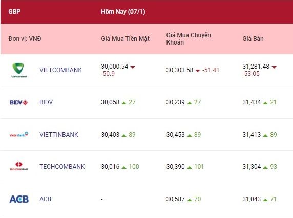 Các ngân hàng khác niêm yết tỷ giá Bảng Anh hôm nay quanh mức 30.000 đồng (mua) và 31.434 đồng (bán).