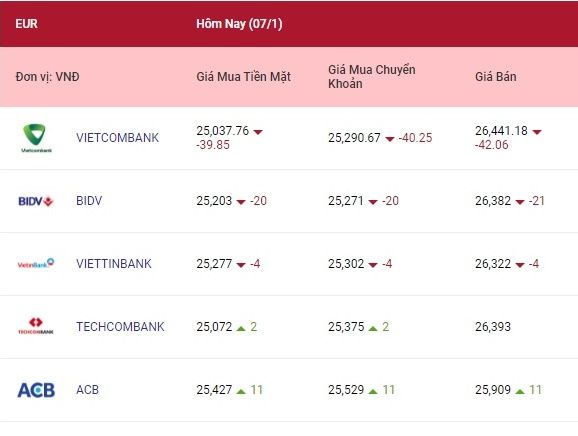 Các ngân hàng khác niêm yết tỷ giá Euro hôm nay quanh mức 25.037 đồng (mua) và 26.441 đồng (bán).