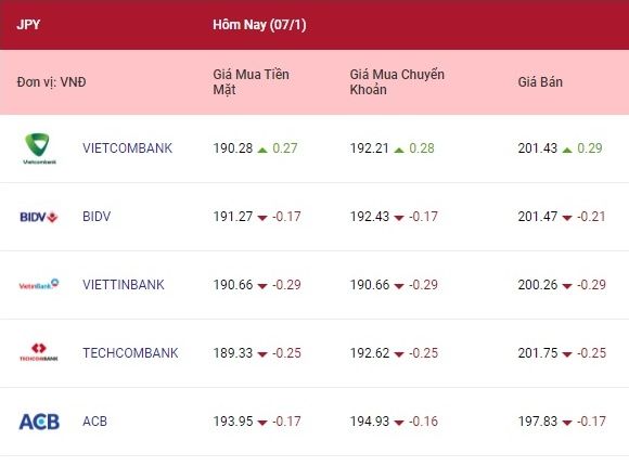 Ngân hàng Nhà nước niêm yết tỷ giá Yên Nhật của phiên giao dịch hôm nay 7/1 ở mức: 194 đồng (mua) và 205 đồng (bán).